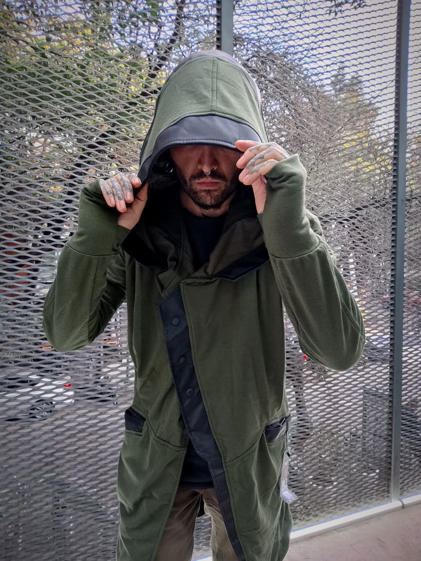 - Hoodie largo semipesado con cortes, pliegues y detalles en cuerina textil con abertura inferior.